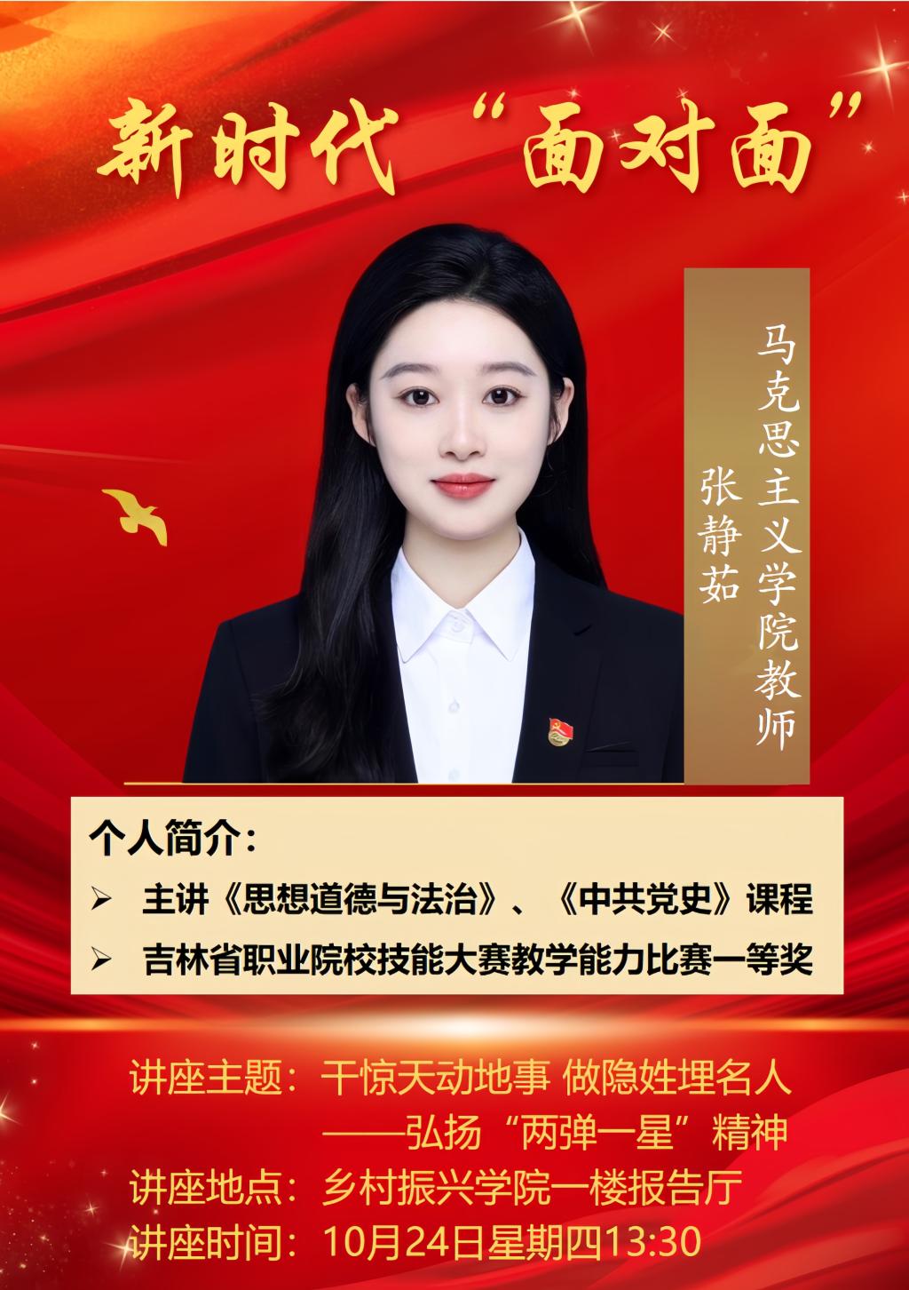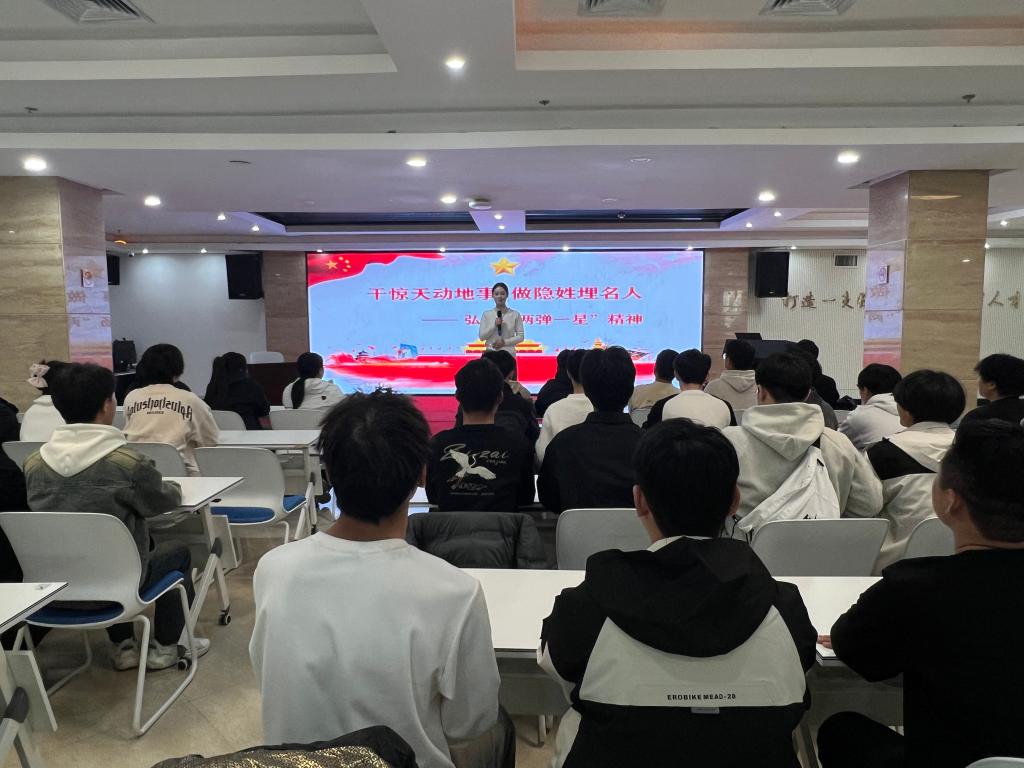 此次讲座由我院优秀青年教师张静茹主讲,她从“两弹一星”的研制原因、研制过程以及弘扬“两弹一星”精神这三个方面进行了深入浅出地讲解。她怀揣着对科学家精神的崇高敬意,和同学们一起追忆了那段激情燃烧的岁月。在场学生无一不被“两弹一星”元勋们鲜为人知的故事和感人至深的爱国情怀深深打动。